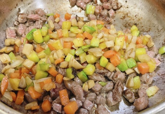 가장 먼저 해야 할 일 - 재료 준비. 쇠고기를 아주 작은 조각으로 자르는 것부터 시작하십시오. 가능하다면 쇠고기를 푸드 프로세서에 넣어서 질감을 더 부드럽게 만들어도 아기가 더 쉽게 먹을 수 있습니다. 야채는 양파, 당근, 애호박, 파프리카를 잘게 다져주세요. 이 야채를 작은 조각으로 자르면 쇠고기와 잘 섞이고 고르게 익혀서 부드럽고 풍미 가득한 찹스테이크가 완성됩니다.
