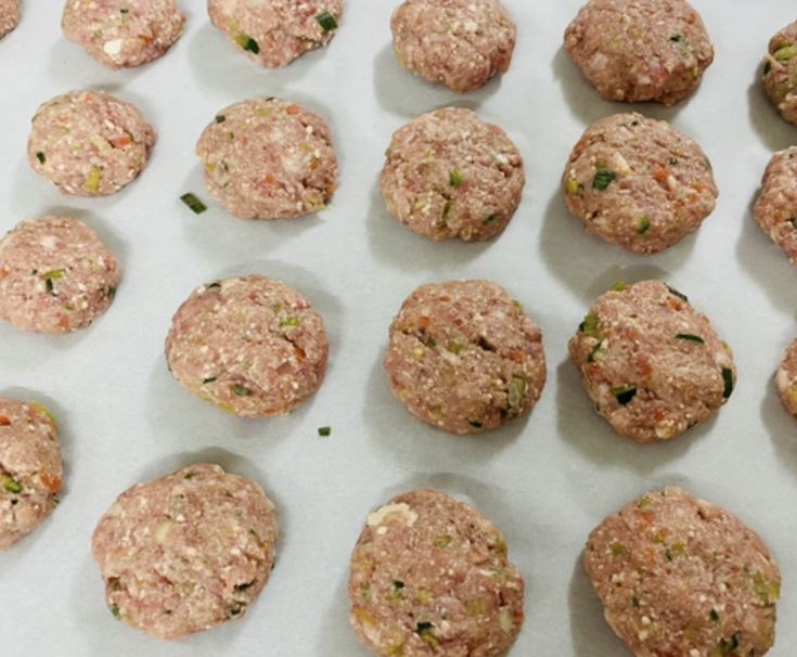 재료 준비부터 시작하세요. 양파, 당근, 호박을 잘게 썰어주세요. 부드러운 농도가 될 때까지 두부를 잘 으깨십시오. 큰 믹싱볼에 다진 돼지고기, 으깬 두부, 다진 야채, 다진 마늘을 넣고 섞습니다.