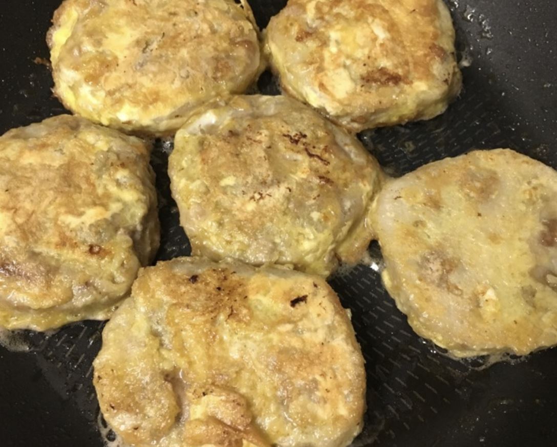 들러붙지 않는 프라이팬을 중간 불로 가열하고 소량의 오일을 추가합니다. 연근 동그랑땡을 프라이팬에 넣고 양쪽이 황금빛 갈색이 될 때까지 3-4분 동안 요리합니다.