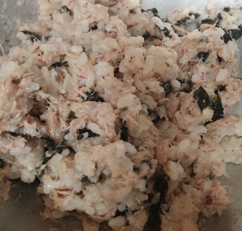 성형에 적합한 따뜻하고 끈끈한 농도로 쌀을 요리하는 것부터 시작하십시오. 어린 참치의 물기를 빼서 남은 물기를 제거하고 작은 그릇에 어린 마요네즈와 섞습니다. 순하고 유아 친화적인 맛을 내기 위해 혼합물에 알룰로스와 소금을 조금 첨가하세요.