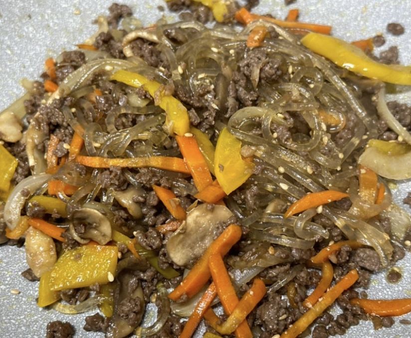 쇠고기가 완전히 익을 때까지 볶은 다음 야채를 넣고 부드러워질 때까지 요리합니다. 다음으로 익힌 고구마 면을 양념 소스와 함께 넣고 맛이 잘 섞일 때까지 섞습니다. 더 쉽게 먹기 위해 저는 면을 서빙하기 전에 짧은 가닥으로 자르는 것을 좋아합니다. 그 결과 작은 손과 성장하는 미뢰에 딱 맞는 부드럽고 풍미 있는 잡채 한 그릇이 탄생했습니다.