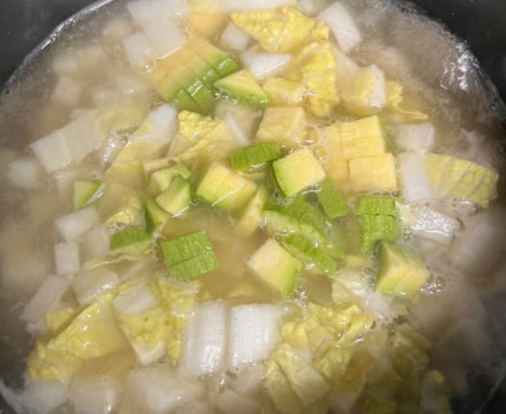 작은 냄비에 물(또는 육수) 2컵을 넣고 살짝 끓입니다. 배추, 호박, 무, 다진 마늘을 넣습니다. 야채가 부드러워질 때까지 5~7분 동안 끓입니다. 이는 편안함과 풍미를 동시에 선사하는 자연적으로 온화하고 약간 달콤한 베이스를 만들어냅니다.