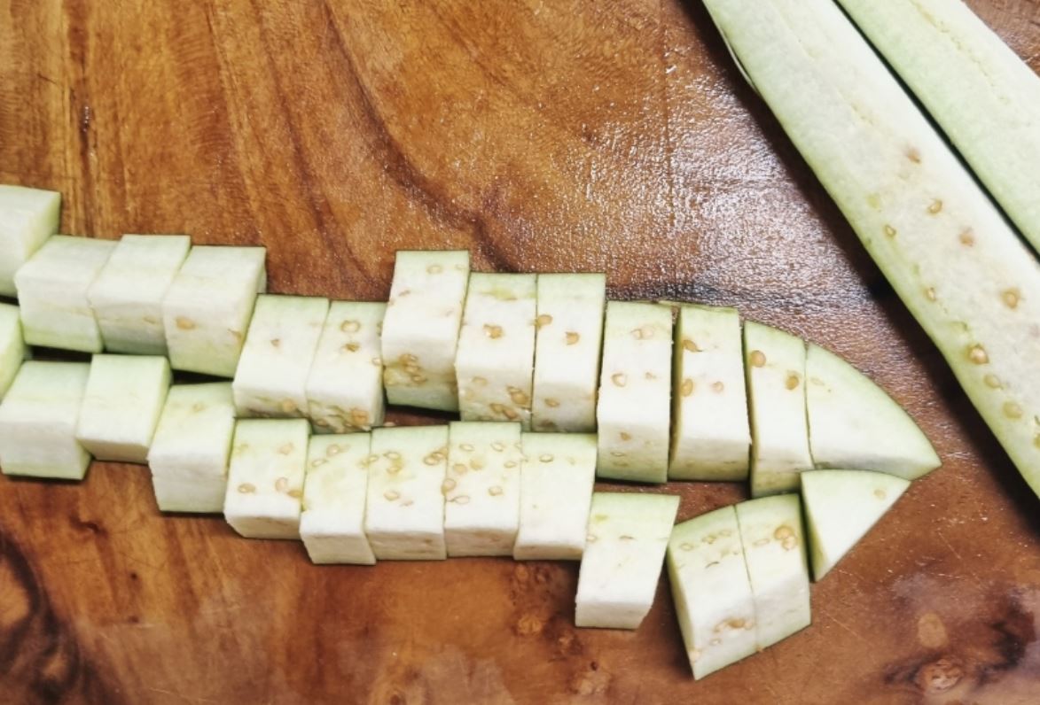 가지를 얇고 고른 조각이나 작은 입방체로 자르는 것부터 시작하세요. 아기가 다루기 쉬운 모양으로 만드세요. 가지를 부드럽게 하고 아기가 먹기 좋게 만들려면 조각을 5~7분 동안 또는 부드러워질 때까지 찌세요. 찌면 가지가 촉촉해지며, 기름을 추가하지 않고도 쉽게 씹을 수 있습니다. 완료되면 가지를 따로 보관하여 약간 식힙니다.