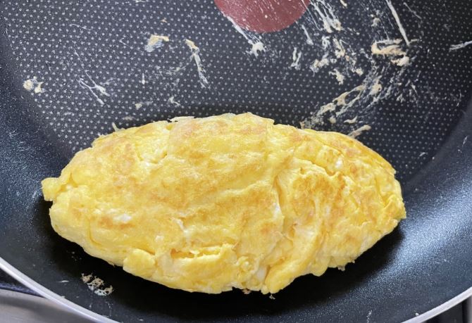 충전재를 추가한 후 주걱을 사용하여 오믈렛을 조심스럽게 반으로 접습니다. 계란이 완전히 굳고 속이 따뜻해질 때까지 1~2분 정도 더 익혀주세요. 오믈렛을 그대로 유지하려면 뒤집을 때 조심스럽게 뒤집으세요. 부드럽고 푹신한 계란 사이로 속이 살짝 보입니다.