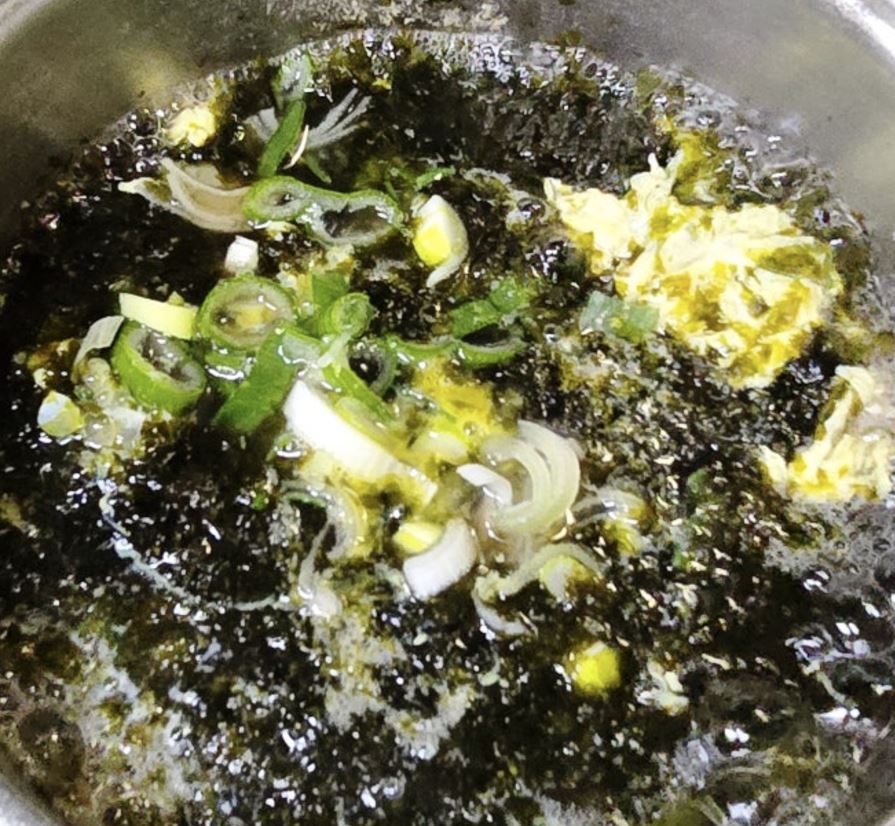 끓고 있는 국에 달걀을 풀어 천천히 붓고 원을 그리며 천천히 저어줍니다. 이렇게 하면 아름다운 달걀 리본이 만들어집니다. 1분 더 끓인 후 불을 끄세요.
