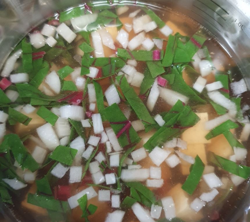근대, 두부 큐브, 다진 마늘, 파를 넣고 섞습니다. 근대가 부드러워지고 풍미가 서로 섞일 때까지 5~7분 더 끓입니다.