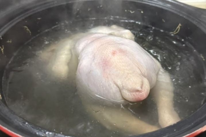 중간 냄비에 물 4컵, 닭다리, 닭 가슴살, 파, 생강 조각, 마늘 정향을 넣습니다. 냄비를 끓으면 불을 약하게 줄여 45분 동안 끓입니다. 닭고기가 요리되면서 국물에서 풍부하고 고소한 맛이 나게 됩니다.