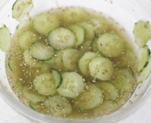 2단계: 준비한 오이 조각을 그릇에 넣고 액체에 완전히 잠기도록 합니다.