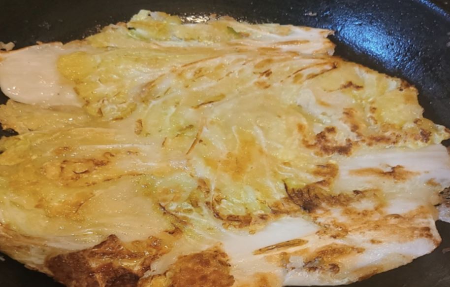 다 구워지면 배추전을 살짝 식혀주세요. 이 배추 전을 즐겁게 우적우적 먹는 모습을 지켜보는 것은 가장 보람찬 순간 중 하나입니다.