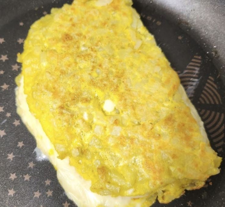 토스트 요리: 식빵 조각을 채우는 쪽이 위로 오도록 프라이팬에 넣었습니다. 밑면을 황금빛 갈색이 될 때까지(약 2~3분) 익힌 다음, 조심스럽게 뒤집어서 속이 따뜻해지고 굳을 때까지 반대쪽도 잠깐 익혔습니다.